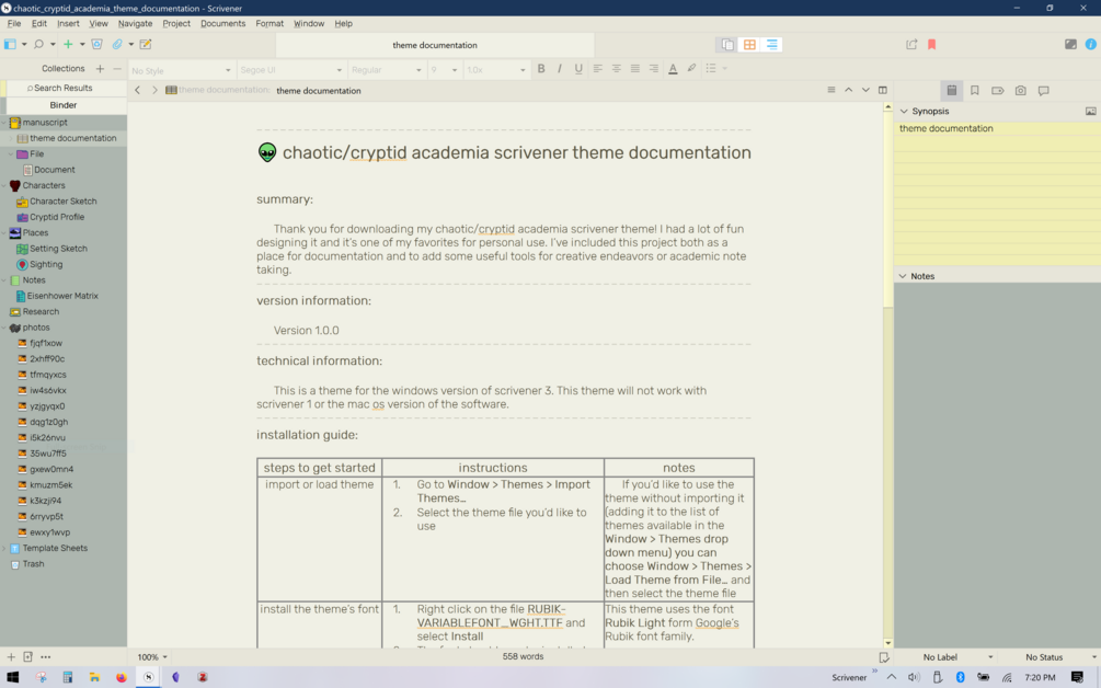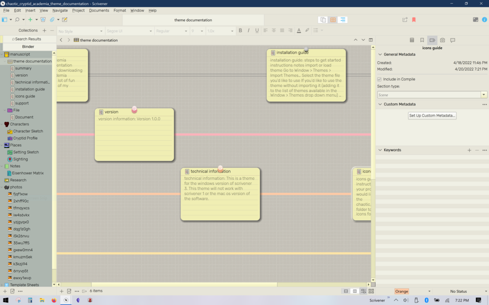 A quirky Windows Scrivener theme for when you're writing chaotic academia inspired works, or you're conducting an iNvEsTiGaTiOn! Writing is hard and making scrivener themes on Windows is also hard, but sometimes having everything in your workspace aesthetic can help get the creativity flowing. I hope the time I've spent perfecting this scrivener theme can help you write great stories, making note-taking a little more interesting, or just bring a smile to your face while you get some creative work done.